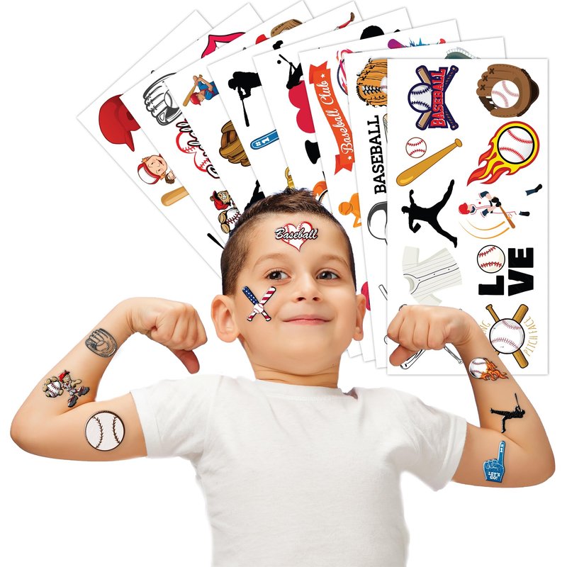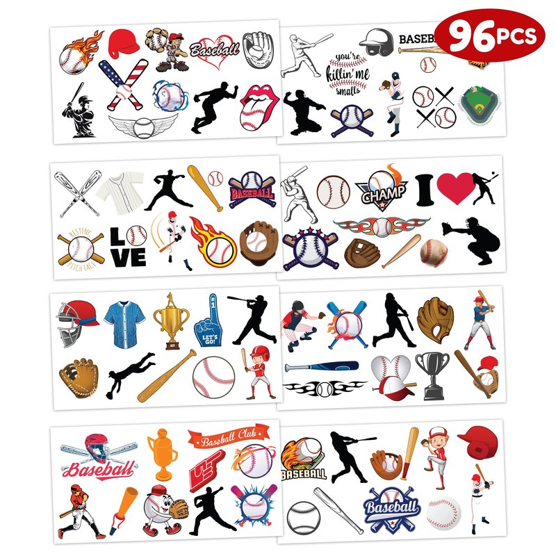 - ⚾【PERFECT TATTOOS FOR THEMED BASEBALL DECORATIONS】: BASEBALL temporary tattoo stickers include 8 sheets in total. There are 96 Pcs super cute tattoo differences. Perfect for giving out party favors and holiday theme small gifts. The size of each sheet is 6.1 * 3.1 inches. One size fits kids.