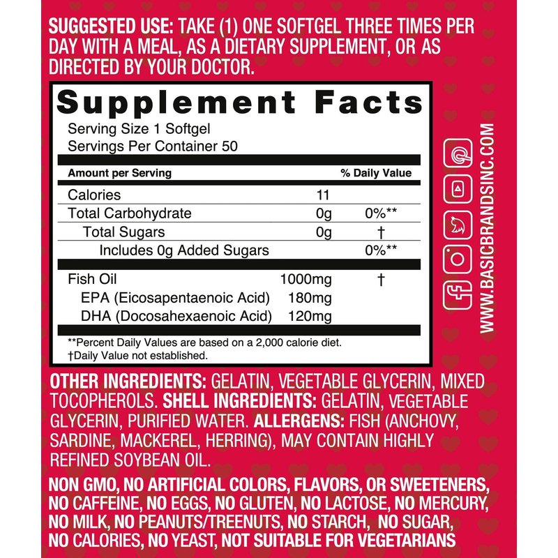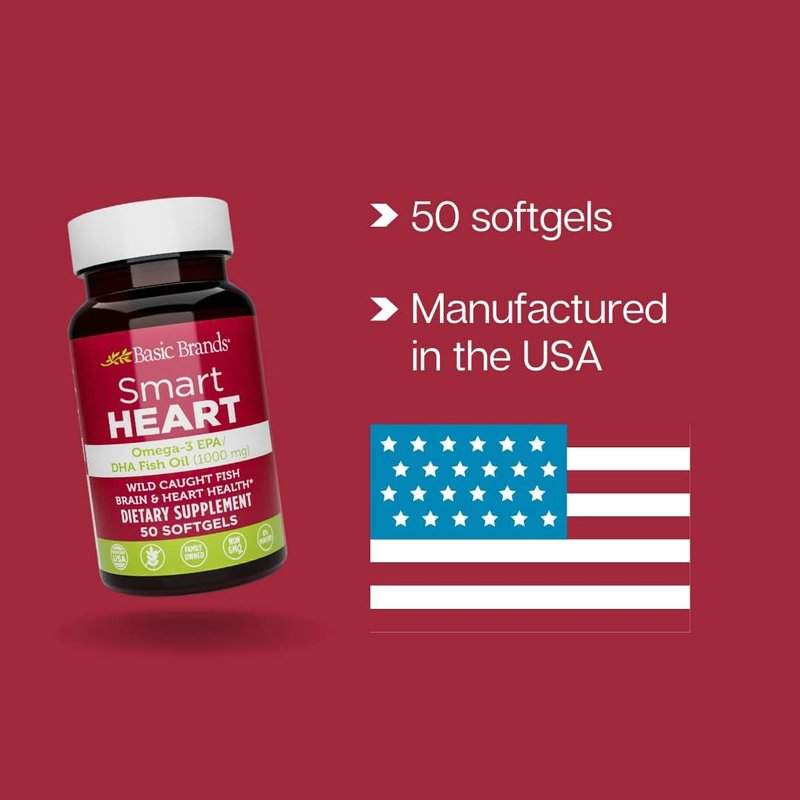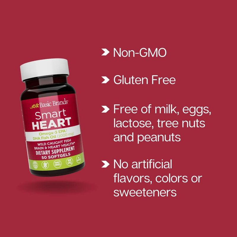 Basic Brands SMART HEART Omega-3 EPA/DHA Fish Oil only comes from wild caught fish and is purified to eliminate mercury. These heart healthy high-quality ingredients include Omega-3 EPA and DHA fatty acids which are sourced from fish and shellfish. Each softgel includes 1000 mg of a blended ratio of EPA to DHA, and has more health benefits than the ALA Omega-3 found in flaxseed. Manufactured and quality tested in the USA, SMART HEART Omega-3 is non-GMO, gluten free, caffeine free, sugar free, third-party purity tested and contains no artificial flavors, colors or sweeteners. The softgels also contain no milk/lactose/eggs or tree nuts/peanuts. Recommended Use: Take one (1) softgel three times per day with water, preferably with meal(s), as a dietary supplement. * These statements have not been evaluated by the FDA. This product is not intended to diagnose, treat, cure, or prevent any disease.