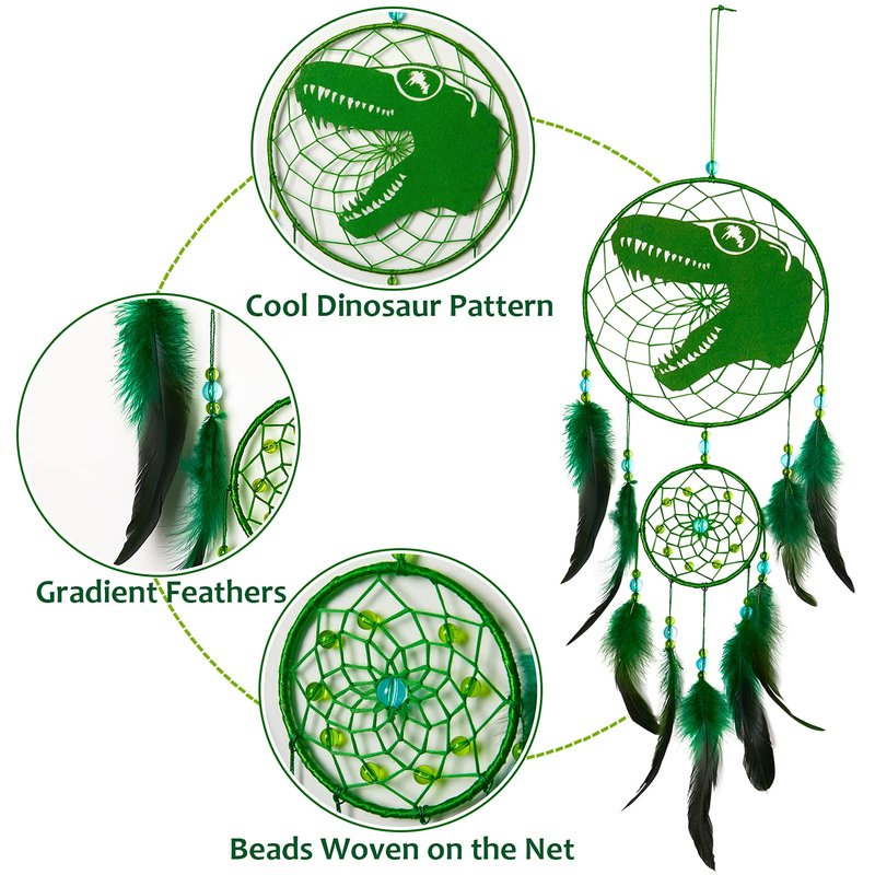 - [UNIQUE DESIGN]--The dinosaur dream catcher is weaved by hand. The dinosaur patch is fixed on the round net and will stay firmly. There are green feathers hanging on the circle to make it looks more cool. Green and blue beads are strung on the threads.