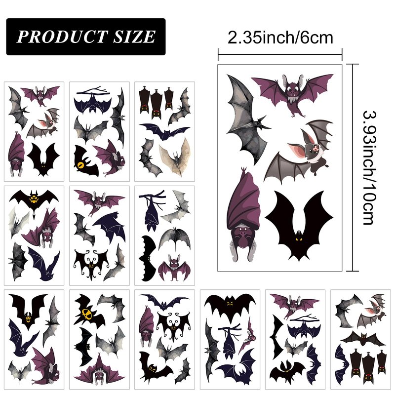 - Halloween Bat Temporary Tattoos: If you're enchanted by the mystique and beauty of bats, our set of temporary bat tattoos will surely leave you in awe. With 12 sheets featuring a total of 60 exquisite and charming designs, our collection is a must-have for bat enthusiasts of all ages. Each sheet measures 3.93 * 2.35 inches.