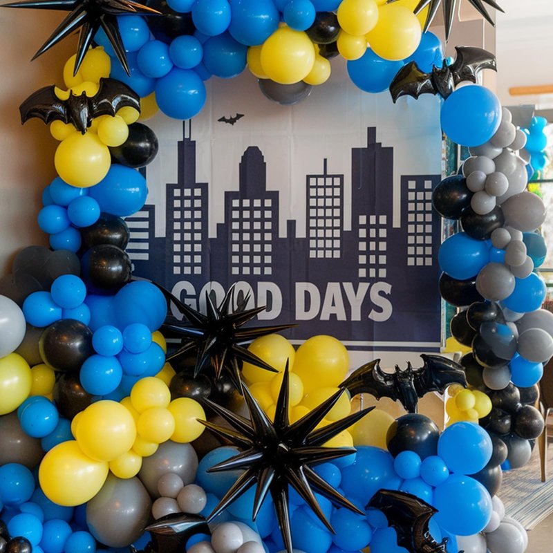 - 【 Yellow Black Grey Balloon Arch Kit】The Bat Theme Garland Kit includes a colorful balloon kit in various colors and sizes:2pcs 18-inch balloons (Yellow*1, Black*1),40pcs 12-inch balloons (Yellow*13, Black*13, Dark Blue*14),30pcs 10-inch balloons (Yellow*5, Black*5, Grey*15, Dark Blue*5),30pcs 5-inch balloons (Yellow*10, Black*10, Dark Blue*10),Black Star Foil*1,3D Bat Sticker*12,Accessories(Balloon Chain*1,Dispense*3,White Ribbon*1)