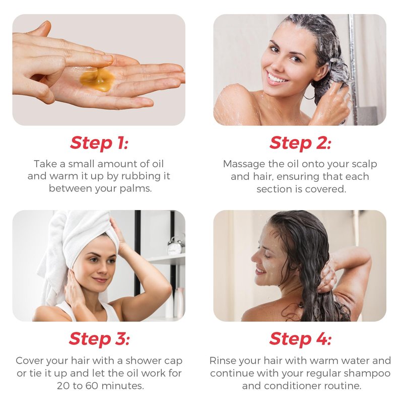 - Easy To Use - 1. Take a small amount of oil and warm it up by rubbing it between your palms. 2. Massage the batana oil onto your scalp and hair, ensuring that each section is covered. 3. Cover your hair with a shower cap or tie it up and let the oil work for 20 to 60 minutes. 4. Rinse your hair with warm water and continue with your regular shampoo and conditioner routine.