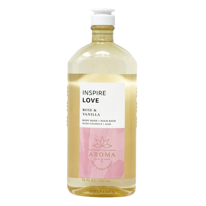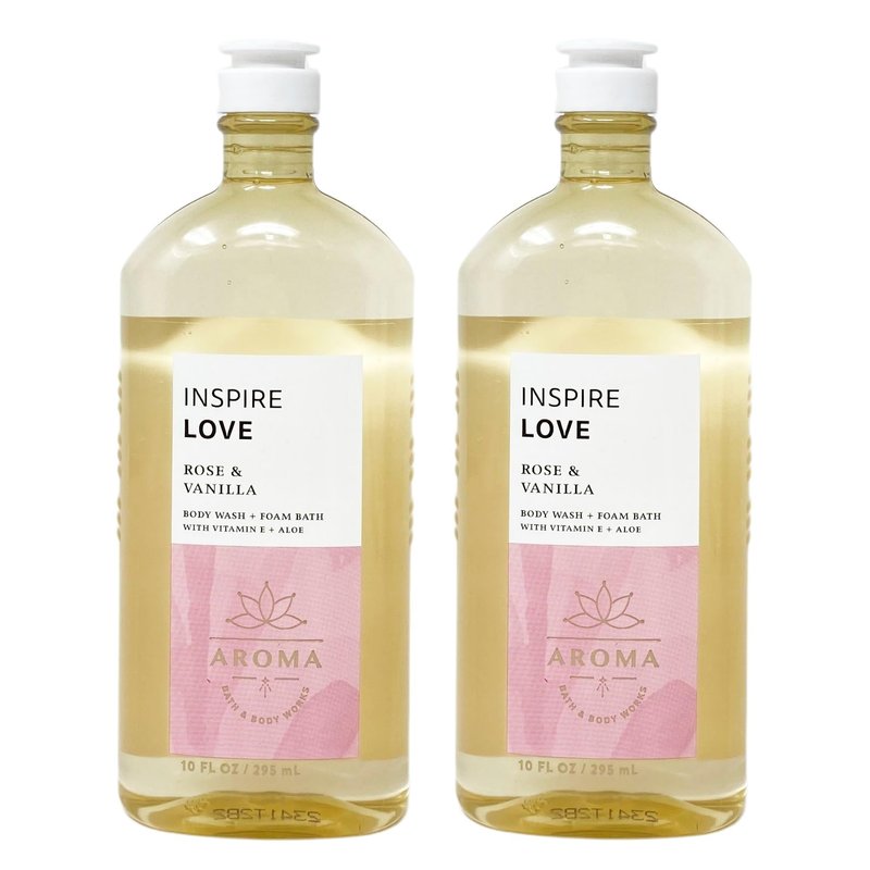 Bath and Body Work Aroma Inspire Love ROSE & VANILLA Body Wash + Foam Bath Bundle. INCLUDES: 2 Body Wash + Foam Baths (10 fl oz / 295 mL each). What it smells like: a sweet, smooth floral created to inspire all the love. Fragrance notes: rose essential oil and vanilla absolute.