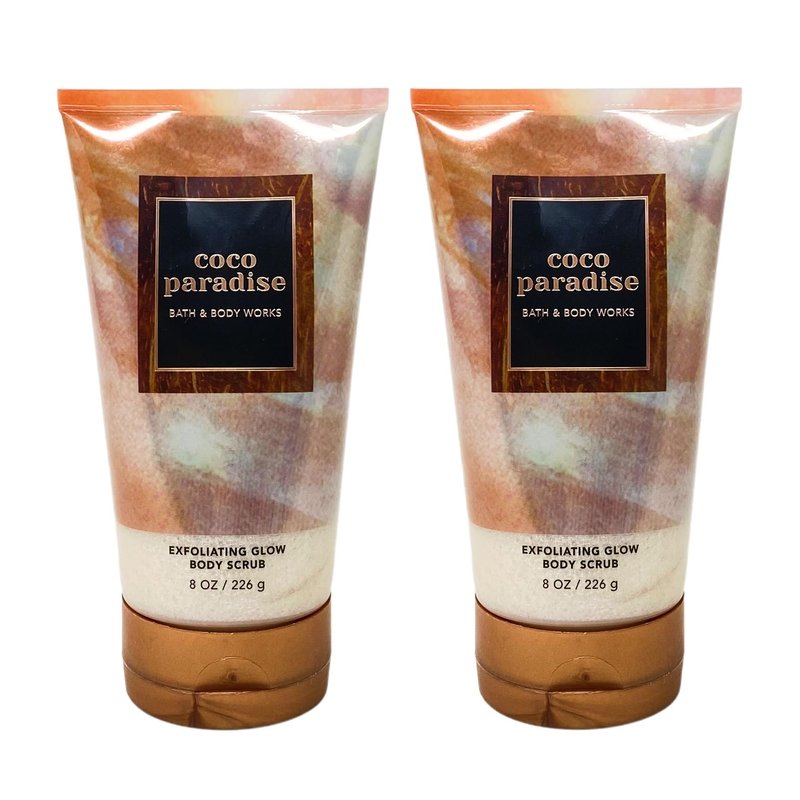 Bath and Body Work Coco Paradise Exfoliating Glow Body Scrub Value Pack. INCLUDES: 2 Exfoliating Glow Body Scrubs (8 oz / 226 g each). What it smells like: stepping into a warm, sweet, soothing oasis of luxury. Fragrance notes: salted coconut monoi, sugared neroli and bronzed sandalwood. What it does: leaves skin feeling smooth and soft and looking healthy and radiant. Infused with the good stuff (shea butter and vitamin E). The glow up your routine needs.