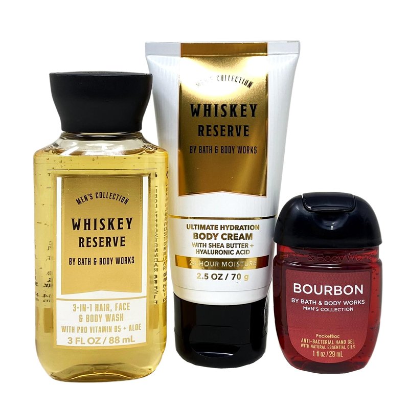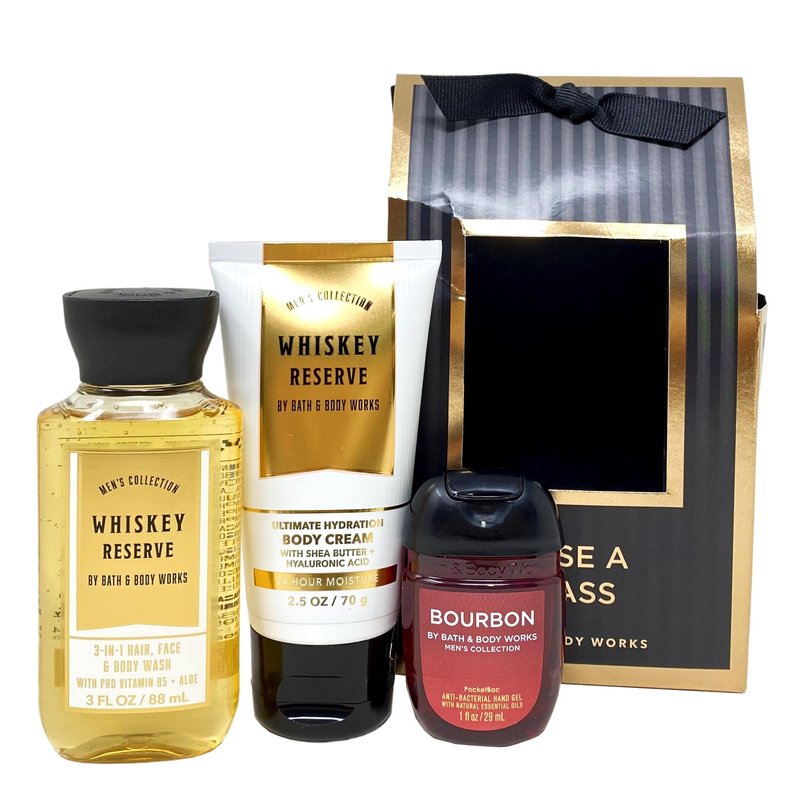 Bath and Body Work WHISKEY RESERVE Raise A Glass Trio Mini Gift Bag Set. INCLUDES: 2.5 oz / 70 g travel Ultimate Hydration Body Cream, 3 fl oz / 88 mL travel 3-in-1 Hair, Face & Body Wash, and a 1 fl oz / 29 mL mini Bourbon Hand Gel. What it smells like: slightly sweet, barrel-aged Scotch, neat. Fragrance notes: crisp apple, single malt whiskey and white oak. What it does: makes gifting so easy and puts a smile on their face. The best way to cheers to a celebration. Product comes arranged inside a decorative gift bag. Bag measures 9.4" H x 5.75" W.