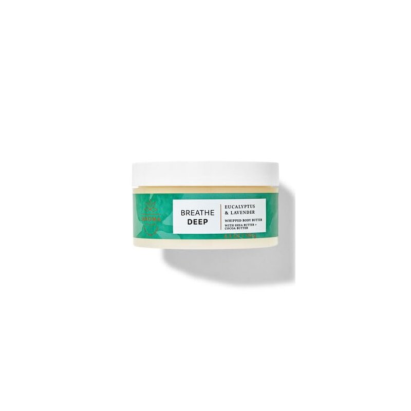 Bath & Body Breathe Deep - Eucalyptus & Lavender Whipped Body Butter with Shea Butter and Cocoa Butter. What it smells like: refreshing, soothing "me time" in the steam room. Fragrance notes: eucalyptus and lavender essential oils. What it does: provides over 24 hours of intense moisture. Why you'll love it: Infused with the good stuff (natural essential oils, shea and cocoa butters and coconut oil) Whipped, fluffy texture absorbs quickly Made without parabens or artificial dyes Dermatologist tested