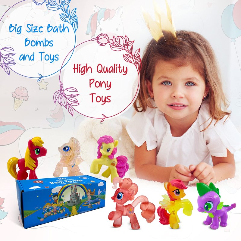 - ✅ SAFE FOR YOUR KIDS - These safe and beautiful kid's bath bombs with PONY toys inside are the perfect way to turn bath time into a treasured moment. Handmade in the USA of organic and natural ingredients, that don’t cause an allergic reaction and are totally harmless for kid`s health. Once dropped in water, these bath fizzies will float and fizz, giving water a vibrant color.