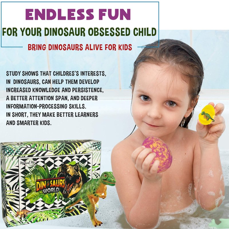 - 12 Colored Dino Egg Bath Bombs Set - Surprise dinosaur toy reveals when bath bombs fizz out! These dino bath bombs make bath time fun and relaxing for kids age 3, 4, 5, 6, 7, 8, and 9 years old