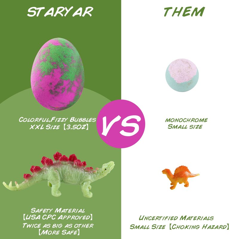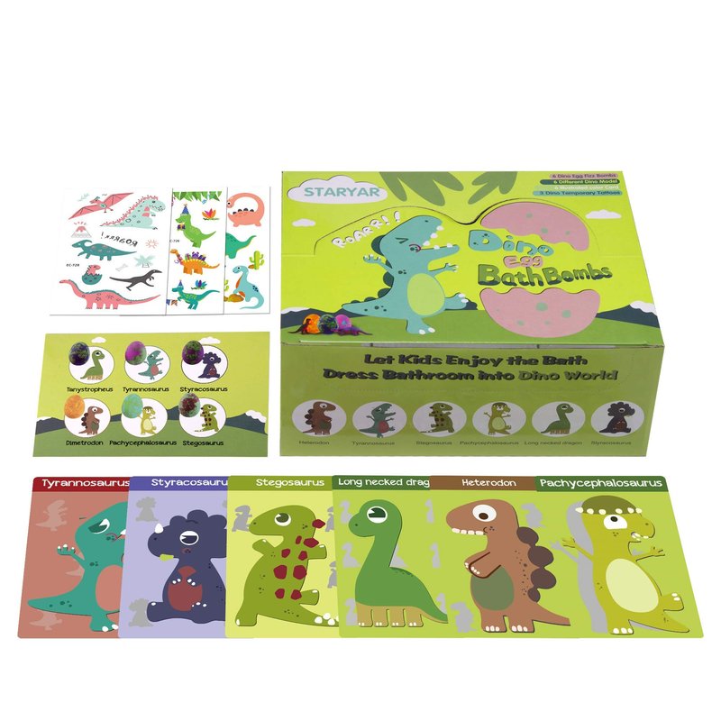 - Gifts for Kids and 6 Colorful Dino Egg Bath Bombs Set: STARYAR kids bath bombs gifts set can be used as dinosaur toys for kids, includes 6 colorful dino egg bath fizzies(5.3 OZ) with different dinosaur inside, extra-large bath bombs and dinosaur toys are safer for kids age 3, 4, 5, 6 ,7, 8, 9 year old. Perfect for easter bath bombs, easter basket stuffers, easter eggs.