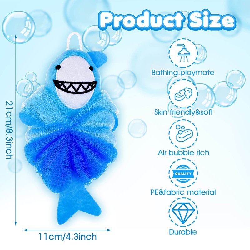 - Lovely Loofah Sponge: you will receive 1 piece of loofahs for kids, designed as a cute blue shark. The shower pouf sponge loofah meshes are approx. 4.3 x 8.3 inches, easy to store in your bathroom, can be washed and hung up to dry after use.