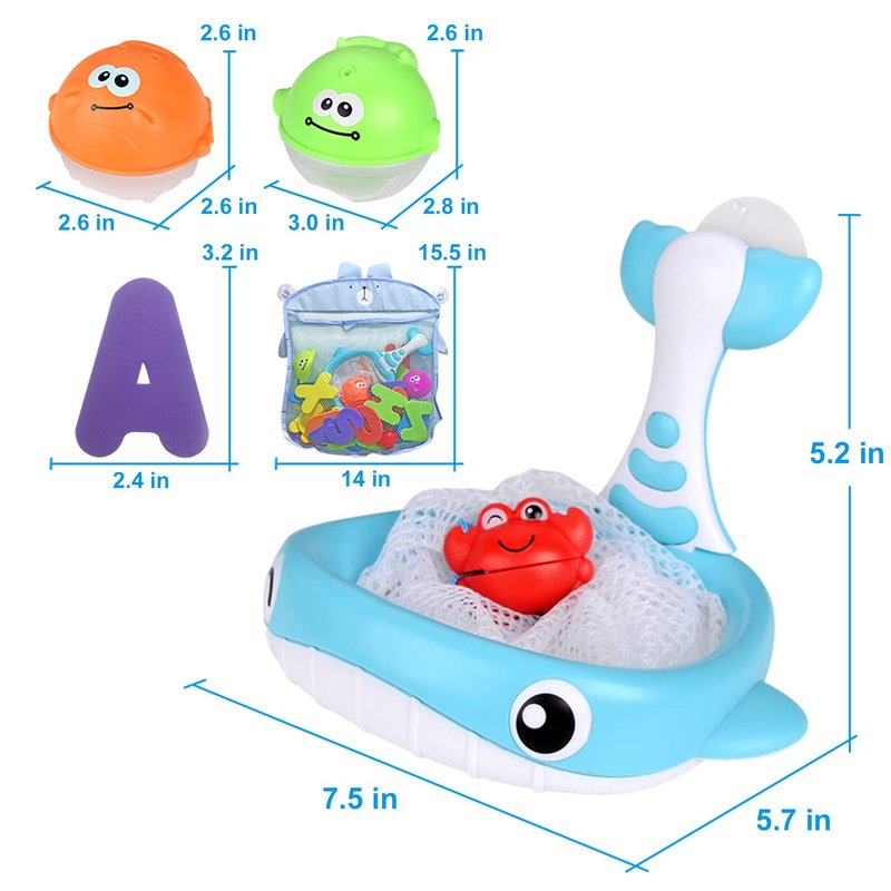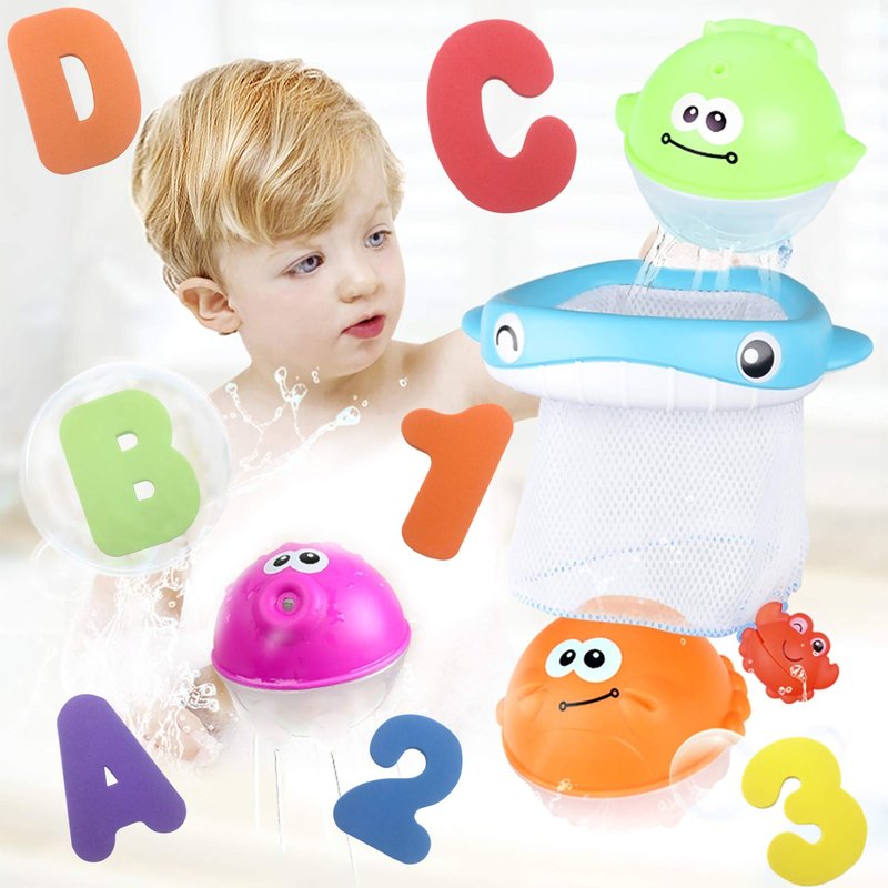 - Bath toy sets including: 26 Letters (A-Z), 10 Numbers (0-9), 3 Floating Squirts Animal Balls, Multifunctional Fishing Net (Basketball Hoop) and Organizer Bag.