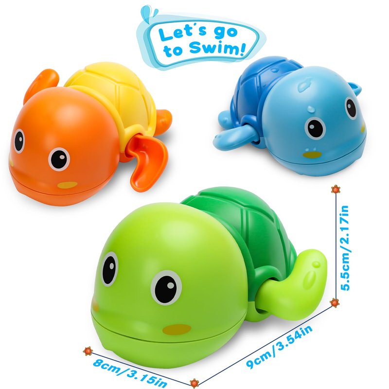 - Wind Up Turtle Bath Toys: The Swimming Turtle Bath Toys Set includes 3 bright colors: Green, Blue, and Orange. Bath time can be a fun and enjoyable experience for your little ones with our 3 Pack cute swimming turtle bath toys! There are perfect bath toys for toddler 1-3 and are sure to keep them entertained while they splash around in the tub. TIPS: Turtle bath toys will hold water, please drain the water through the turtle's mouth after use to keep it dry