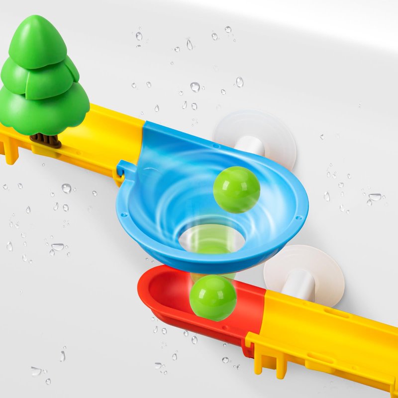 Fun Splicing Tracks Bath Toys The colored balls travels through the wooden house and pine forest on the slide at the mountaintop, spirals and falls onto another track to continue moving forward, quickly passing through the waterwheel.... oh This set of bath toys is so fun! DIY fun splicing tracks bath toys, scene building bath toys for kids toddler.This fun toddler toys turns boring bath time into a wonderful time for parent-child interaction.It's the best Christmas birthday gift for boys and girls