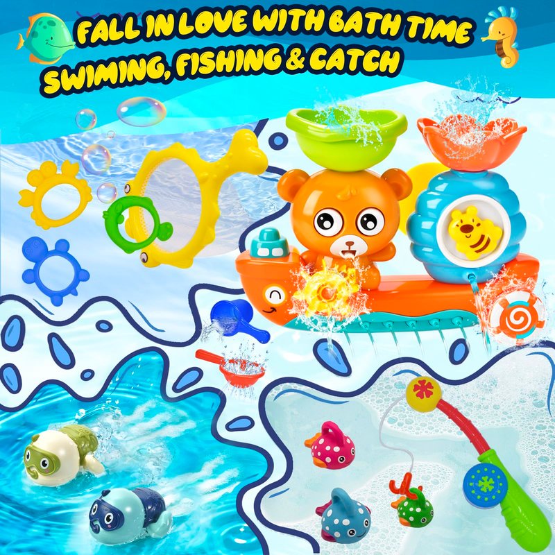 - 【Preschool Toys Set for 1-3 Toddlers】: Children can learn simple knowledge of mechanical movement through filling water into the top of bear bathtub toys to spin eyes, bees, gear, rudder, propeller and creat fountain. Fishing game sets can strengthen kids confidence and patience and developing the hand-eye coordination and body balance ability. It also help toddlers to identify the blue, green, pink 'fish' and catch each one when asked.