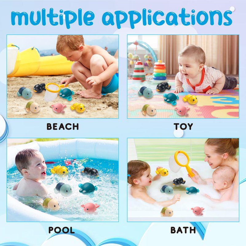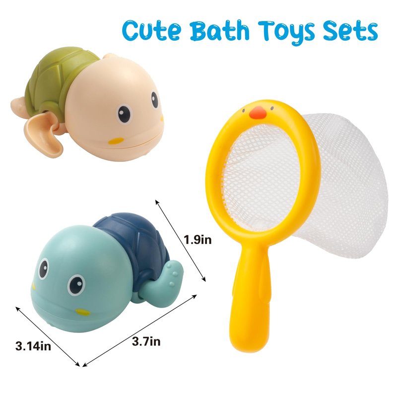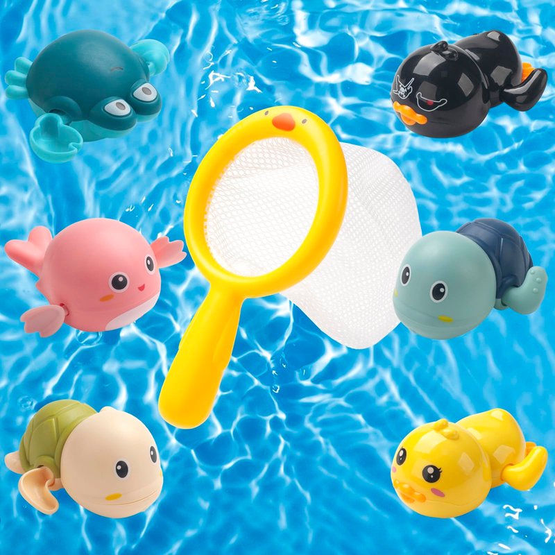 - TODDLER BATH TOYS SET 6PCS - Baby bath toys set includes: lovely swimming turtles, duck set, blue crab, pink whale and 1pcs fishing net, this fishing net can be used as a storage basket. Infant bath toys is suitable for playing shower games and will bring your child a happy and fun bathing time.