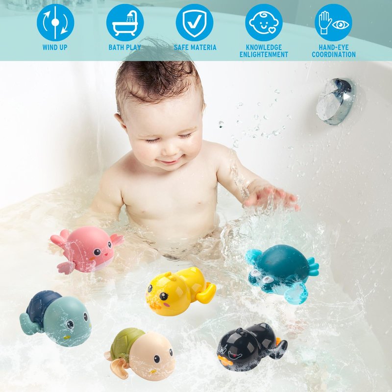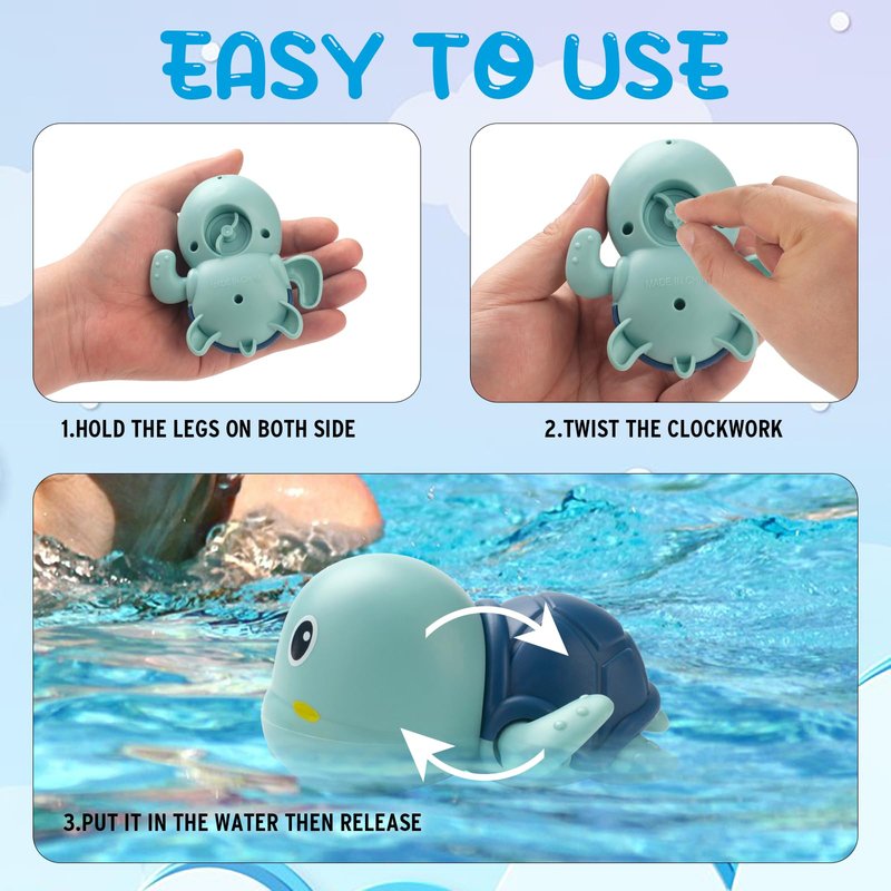 - SAFE MATERIAL BATH TUB TOYS - Cute swimming turtles bath toy is made of non-toxic ABS plastics,safe for contact with children. Toddler bath toys don't have sharp edges, light weight and safe material, the size designed for babies, can be grasped with one hand; The water toys has soft colors to attract baby's attention and enjoy bath more.