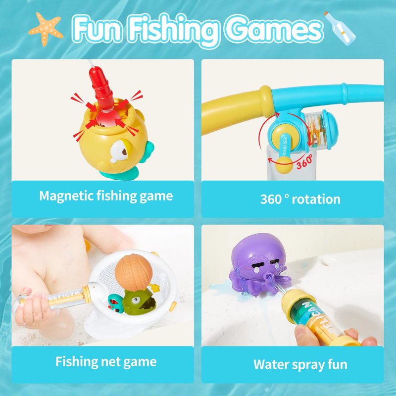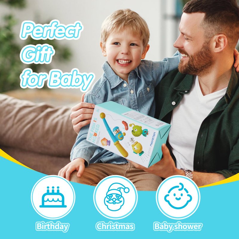 Dive into the world of aquatic adventures with this magnetic fishing toy set for kids ages 1-3! The perfect blend of fun and learning, this set includes a fishing rod, a spinning octopus, two balls, a fishing net, and a storage bag. The colorful and engaging design will captivate your little ones as they practice their hand-eye coordination and develop their motor skills. The magnetic fishing rod allows for easy catch and release, ensuring hours of entertainment in the bathtub, pool, or even on dry land. The spinning octopus and floating balls add an extra layer of excitement, encouraging your child's curiosity and imagination. With its well-made construction and safe materials, this fishing game is not only enjoyable but also designed with your child's safety in mind. Compact and portable, it's the ideal companion for playtime at home or on-the-go adventures. Let your little anglers reel in the fun with this magnetic fishing toy set!