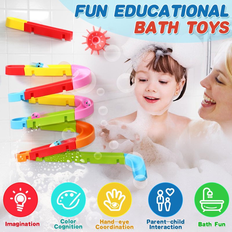 - 【Funny Bath Toys】This great value kids bath toys contains 20 assembly tracks divided into three models ABC, 2 spinning water wheels, 10 suction cups and 6 other cute and fun small parts, so that your kids can DIY different track shapes by themselves and inspire their imagination, creativity and hands-on skills. Bright colours and rolling ball attract your child's attention, your toddler may try to catch it before it falls into the bathtub, the perfect bath companion!