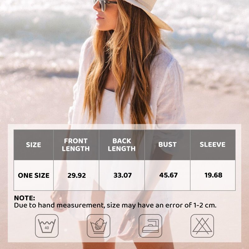 - One Size: The beach cover up is one size and suitable for most people. Shoulder width of beach clothes: 19.29 inches (49cm); Bust: 48.03 inches (122cm); Sleeve length: 19.69 inches (50cm); Front length: 29.92 inches (76cm); Rear length: 33.07 inches (84cm).