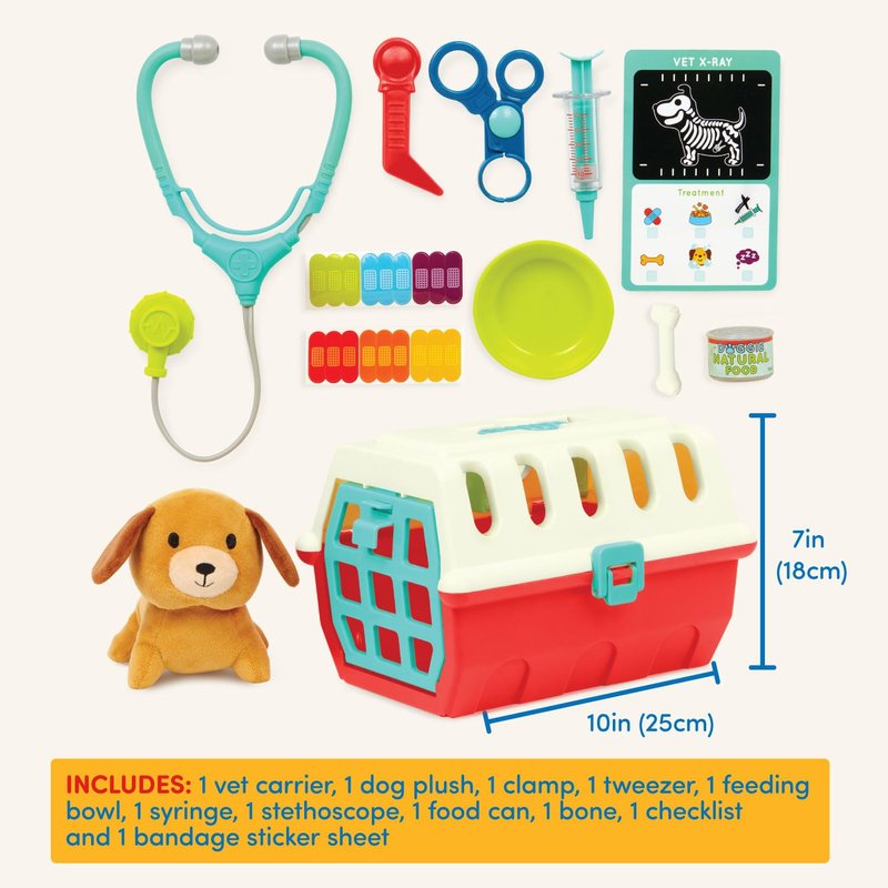 - 11-Piece Set: Includes 1 plush pup, 1 pet carrier, 1 sheet of bandage stickers, 1 vet checklist, 1 stethoscope, 1 pair of tweezers, 1 clamp, 1 syringe, 1 feeding bowl, 1 can of dog food, and 1 dog bone.