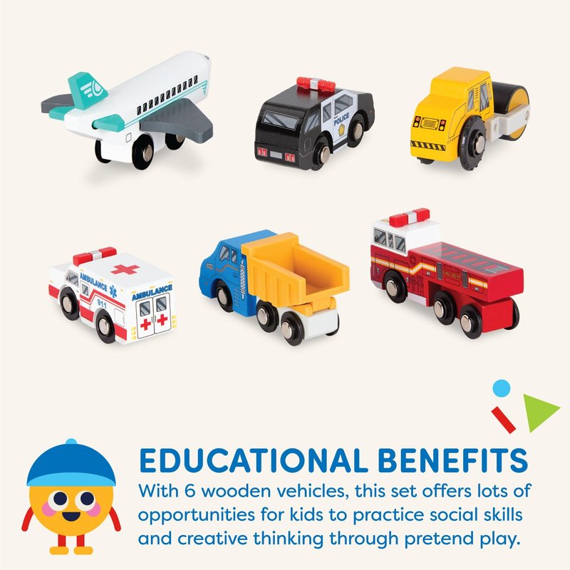 - 6-Piece Set: Comes with an adorable toy dump truck, ambulance, airplane, steamroller, police car, and fire engine!