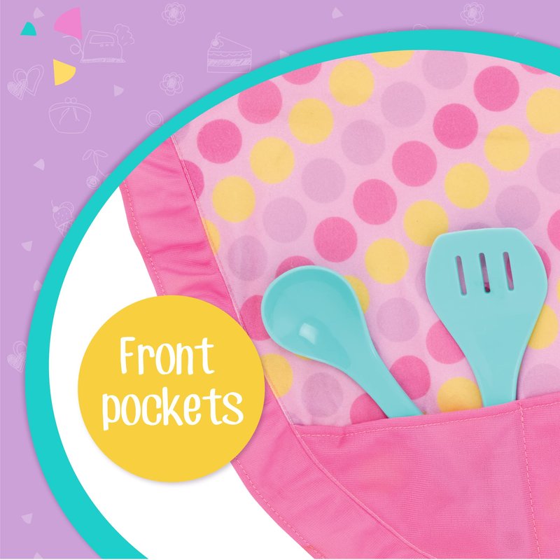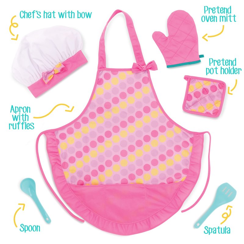 - Includes: (1) apron with ruffles, (1) chef’s hat with bow, (1) pretend oven mitt, (1) pretend pot holder, (1) spatula, and (1) spoon.