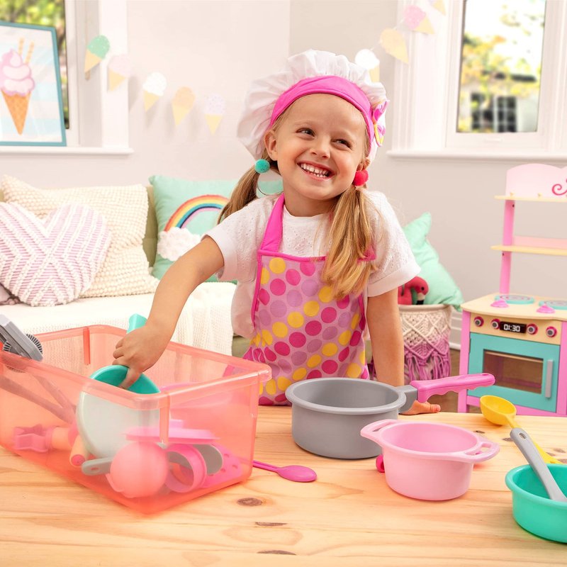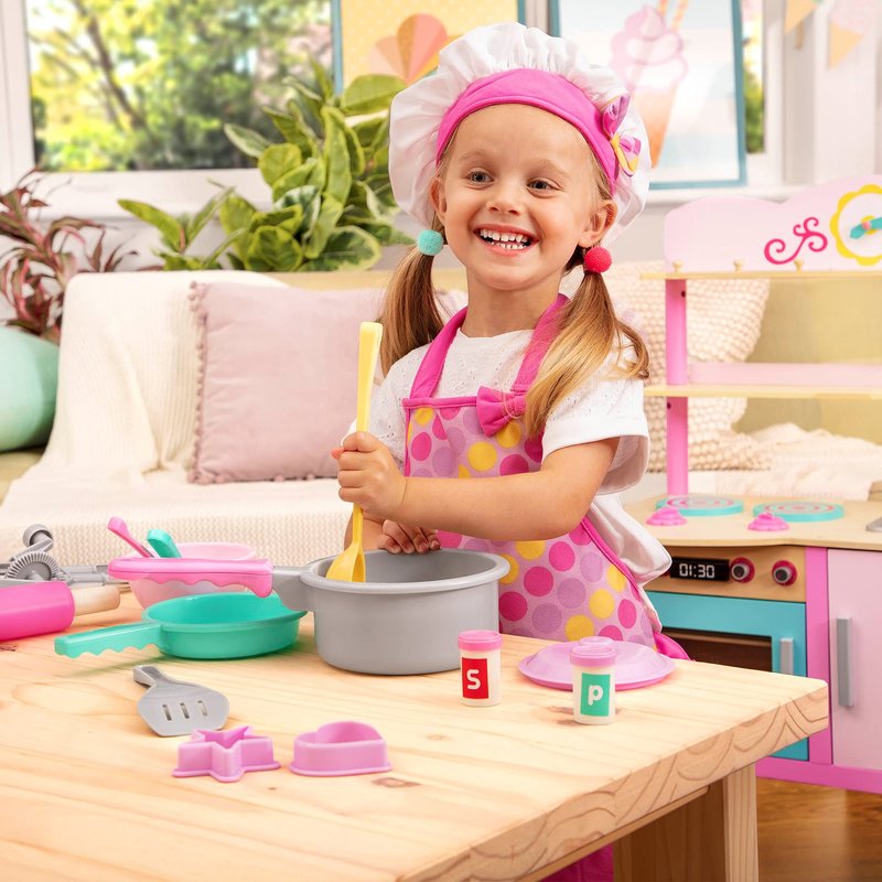 - Chef’s outfit and cooking accessories sized perfectly for small hands and bigger imaginations!