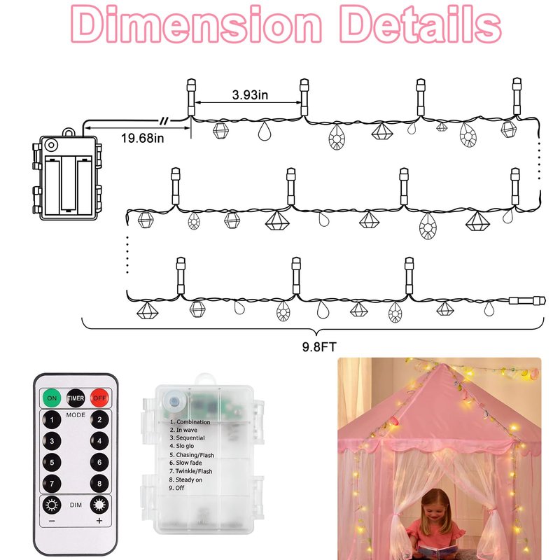 - Handy Remote & Timer: Acrylic gems jewels fairy lights battery operated with a remote control, lighting patterns, brightness and Timer can be easily set in hand. Once you set the timer, the battery powered light string will illuminate for 6 hours and automatically turn off for 18 hours, more energy efficient.