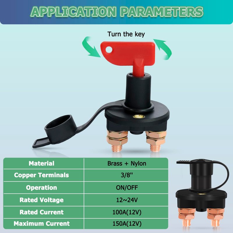- 【APPLICATIONS】Rv battery disconnect switch key is used to connect to the positive terminal of the battery cables, ideal for protecting cars, caravans, motor vehicles, caravans, boats, etc. 2 copper terminals: 3/8". For use with DC 12-24V systems. On/Off 2 positions. Rated current: 100A (12V), Maximum withstand current: 150A (12V).