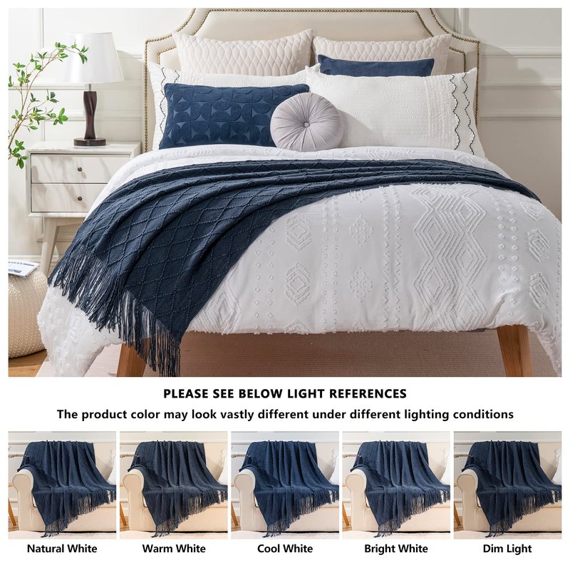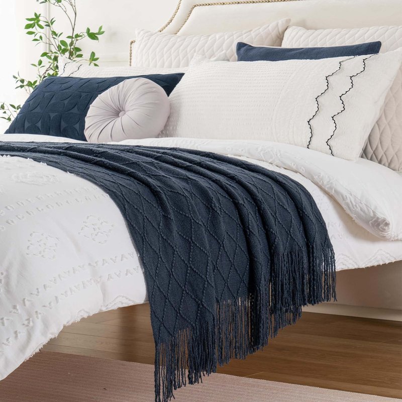 - CHIC DESIGN - This premium navy throw blanket features an elegant decorative fringe and geometric pattern for added style. It's the perfect addition to living rooms, guest rooms, bedrooms, family rooms, couches, sofas and more.