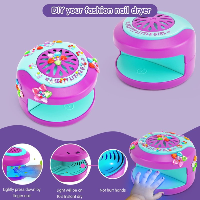- đăKids Manicure Kit with Dryeră: Five nail polishes will dry in 15 seconds after using the dryer, so your girls (and their shimmery nails) can be out the door, and off to their holiday party in a jiffy. In addition, an exquisite set of fake nails will make your little princess stand out.