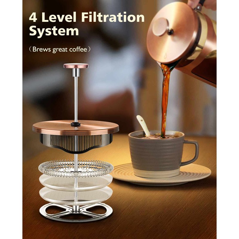 - ☕️ 4-Level Filtration: Our French press uses a 4-level filtration system comprising a metal mesh filter, spring disk, metal cross plate, and a final mesh screen to ensure sediment-free coffee.