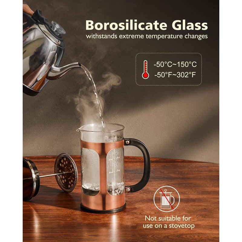 - ☕️ Durable and long-lasting: Made of high-quality borosilicate glass, our French press is resistant to thermal shock and can withstand high temperatures, making it durable and long-lasting.