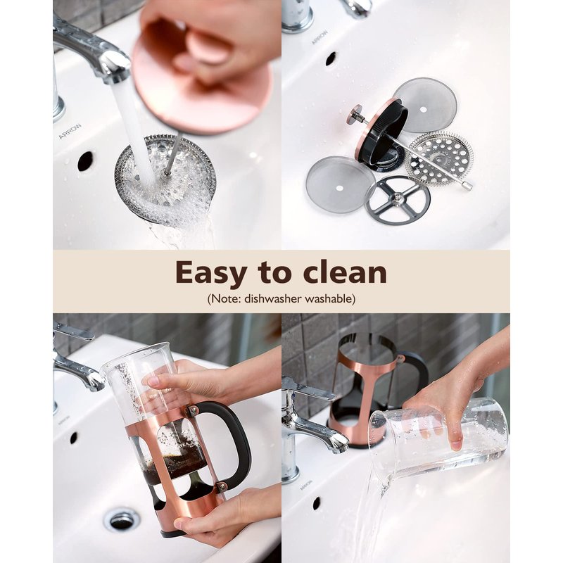 - ☕️ Easy to clean: Our glass French press is designed for easy cleaning. The glass carafe can be easily taken apart for a thorough cleaning, and certain parts, such as the plunger and filter, are dishwasher safe. Say goodbye to the hassle of cleaning other coffee makers and enjoy a hassle-free cleaning experience with our glass French press.