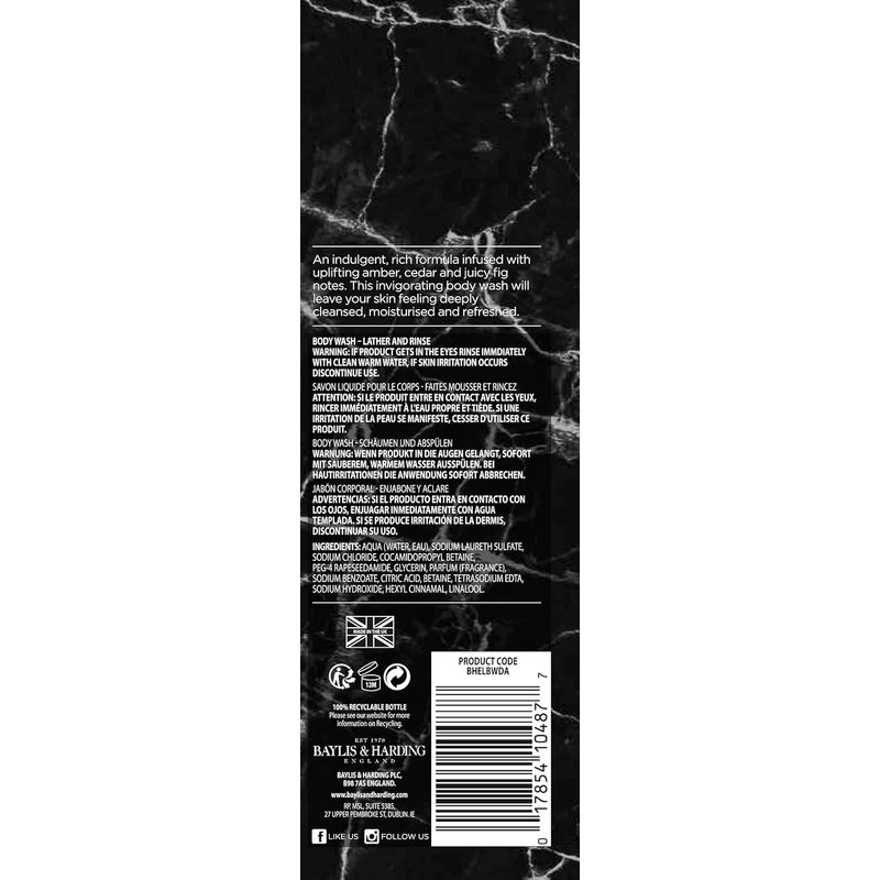 - LUXURY BODY WASH - A rich decadent blend of fruity and spicy top notes with rich base notes of Dark Amber & Fig. This alluring scent will warm your senses whilst leaving body cleansed and slightly fragranced.
