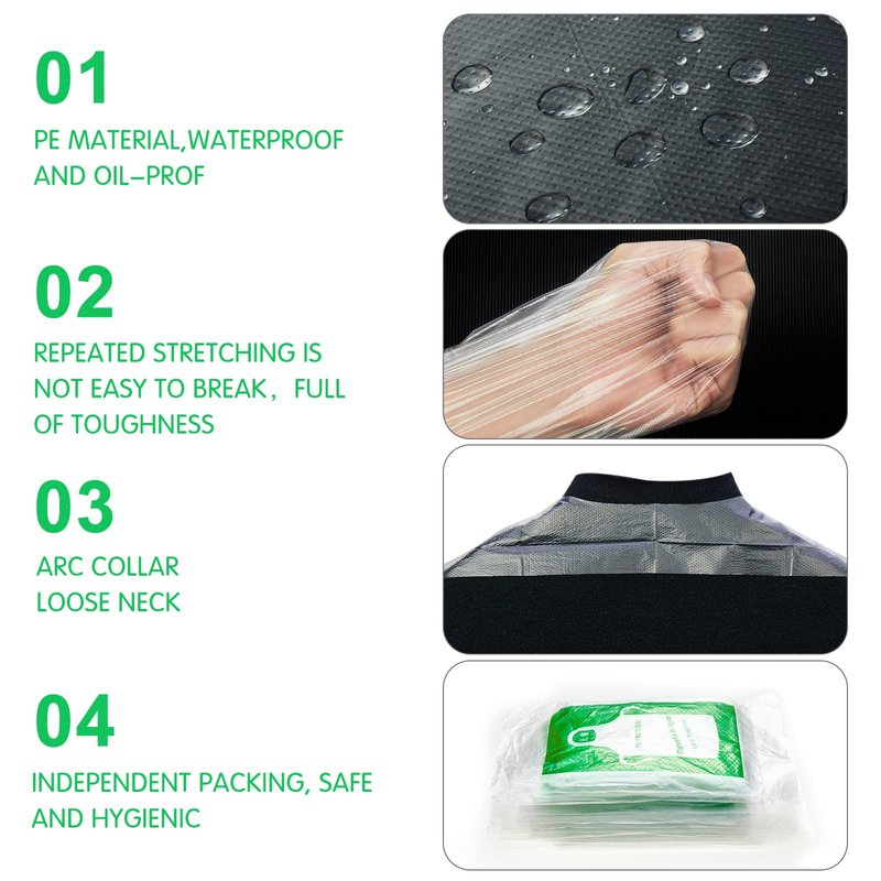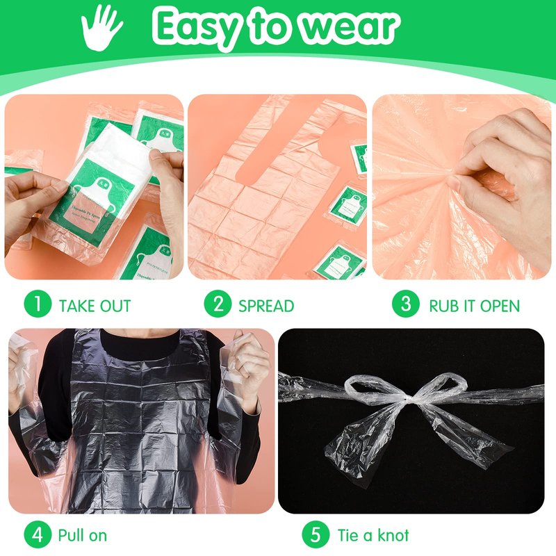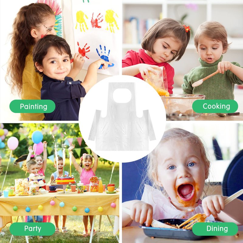 - 【Safe Material】This disposable aprons kids are made of quality food-grade PE, durable and safe to use. The plastic aprons are waterproof and oil-proof, it can be used in various occasions in life. Disposable design, just throw away when you use it up, no longer worry about the mess after children's activities.