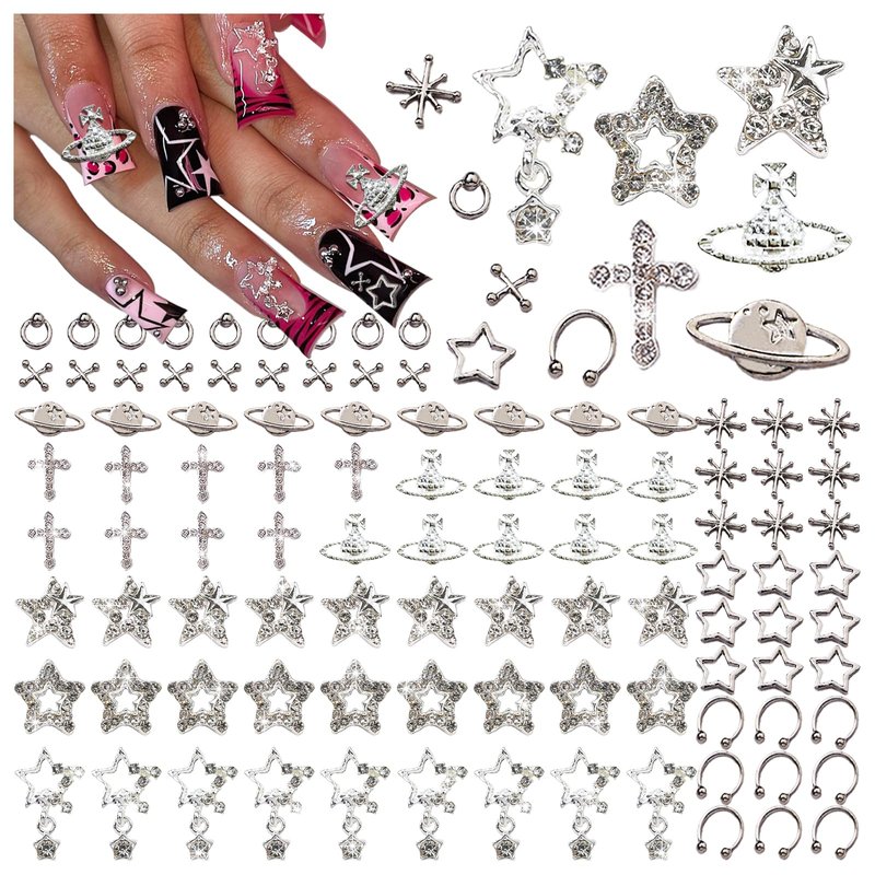 BBATT-HAPPY 110PCS Star Nail Charms for Acrylic Nails,Silver Star Planet Cross Alloy Nail Art Decoration, Nail Stones Nail Jewels Accessories for Nail Art Supplies Manicure Craft DIY