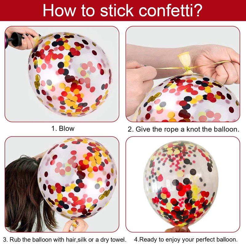 Red, black and yellow set balloons, taste the romantic atmosphere in life together. Product Name: Red, Black and Yellow Balloons. Material: Latex. Color: red black yellow. Size: 10 inches, 12 inches. Quantity: 85pcs. Package includes: 10-inch red 25pcs, 10-inch yellow 25pcs, 10-inch black 25pcs, 12-inch confetti 10pcs. Feature: ✨1.Colour balloons made with high quality latex, strong and durable, not easy to break, supports air and helium. ✨2. Confetti balloons are perfect for red black yellow them parties, children's birthday parties, baby showers, etc.