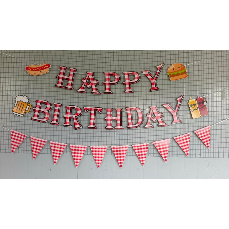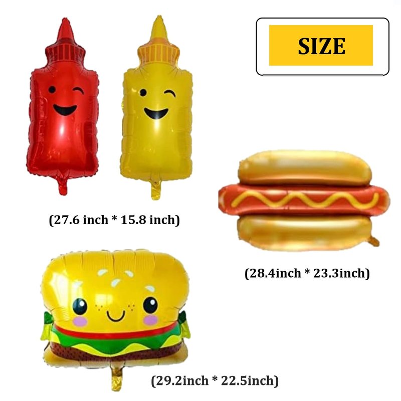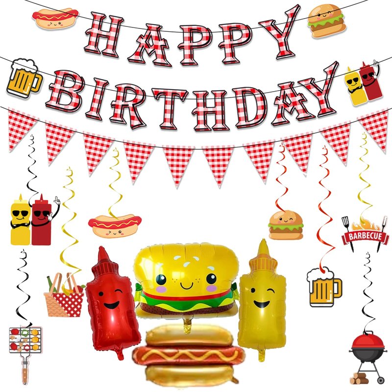 - Package: you will receive 1pc HAPPY BIRTHDAY banner, 1pc red white and pink checkered banner, 8pcs hanging swirls with spirals, 4pcs balloons included 1 hamburger, 1ketchup, 1 mustard and 1 hot dog shaped balloons