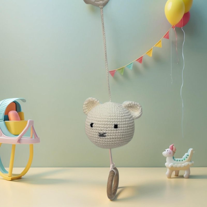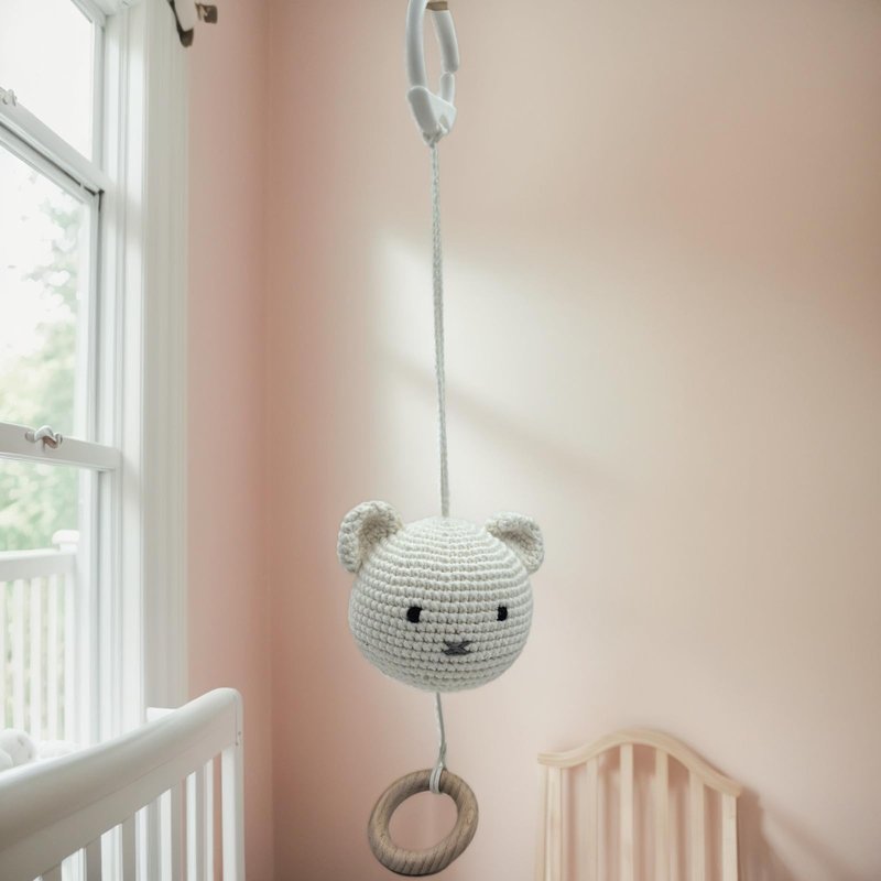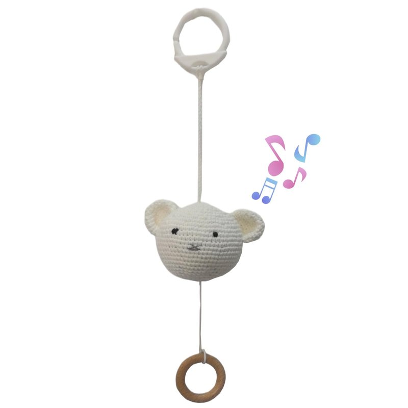 BBYP Baby Hanging Musical Box Toys, Soothing Musical Pulldown Toy with Wooden Teether, Crochet Musical Bear Head Toys for Newborn Infant Baby Toys for 0, 3, 6, 9, 12 Months