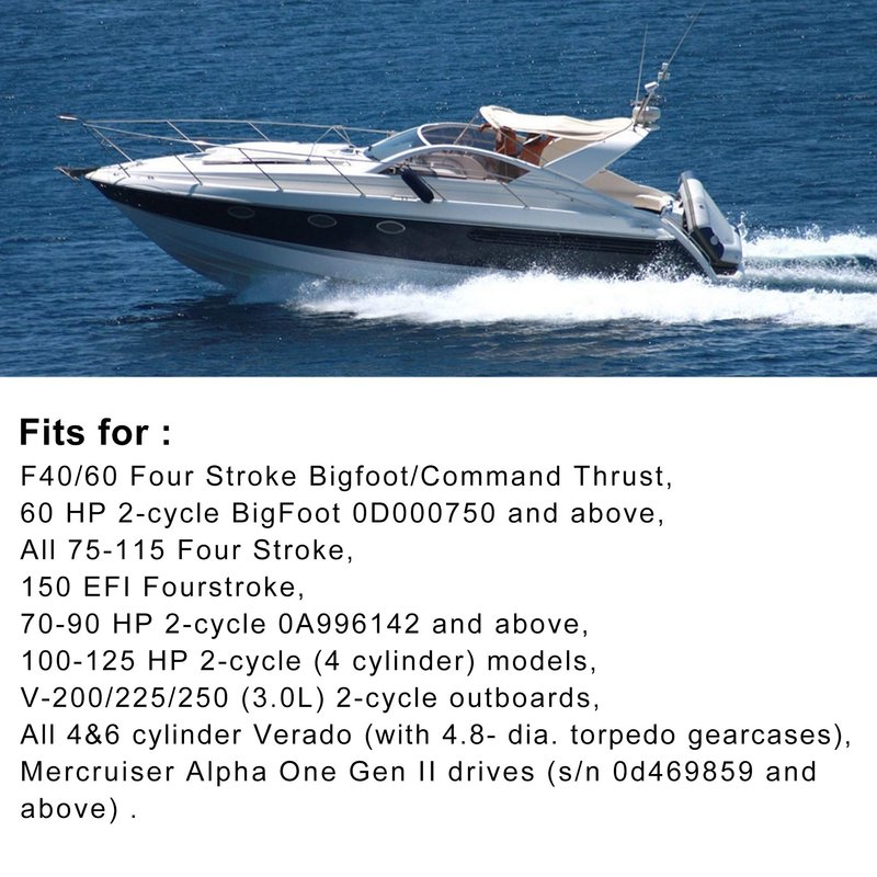 - Fits: F40/60 Four Stroke Bigfoot/Command Thrust, 60 HP 2-cycle BigFoot 0D000750 and above, All 75-115 Four Stroke, 150 EFI Fourstroke, 70-90 HP 2-cycle 0A996142 and above, 100-125 HP 2-cycle (4 cylinder) models, V-200/225/250 (3.0L) 2-cycle outboards, All 4&6 cylinder Verado (with 4.8- dia. torpedo gearcases), Mercruiser Alpha One Gen II drives (s/n 0d469859 and above).