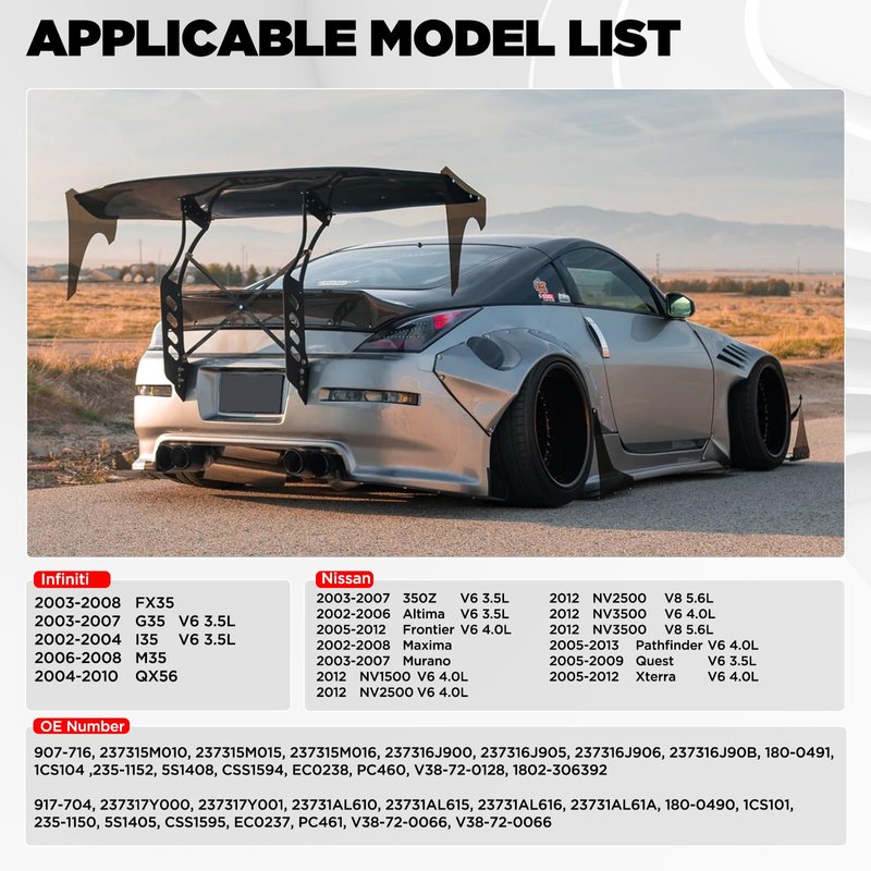 Fitments: INFINITI FX35 2003-2008 INFINITI G35 2003-2007 INFINITI I35 2002-2004 INFINITI M35 2006-2010 NISSAN 350Z 2003-2007 NISSAN ALTIMA 2002-2006 NISSAN FRONTIER 2005-2012 NISSAN MAXIMA 2002-2008 NISSAN MURANO 2003-2007 NISSAN NV1500 2012-2013 NISSAN NV2500 2012-2013 NISSAN NV3500 2012 NISSAN PATHFINDER 2005-2012 NISSAN QUEST 2004-2009 NISSAN XTERRA 2005-2012 Replaces Part Numbers: 907-716, 237315M010, 237315M015, 237315M016, 237316J900, 237316J905, 237316J906, 237316J90B, 180-0491, 1CS104 ,235-1152, 5S1408, CSS1594, EC0238, PC460, V38-72-0128, 1802-306392, 917-704, 237317Y000, 237317Y001, 23731AL610, 23731AL615, 23731AL616, 23731AL61A, 180-0490, 1CS101, 235-1150, 5S1405, CSS1595, EC0237, PC461, V38-72-0066, V38-72-0066