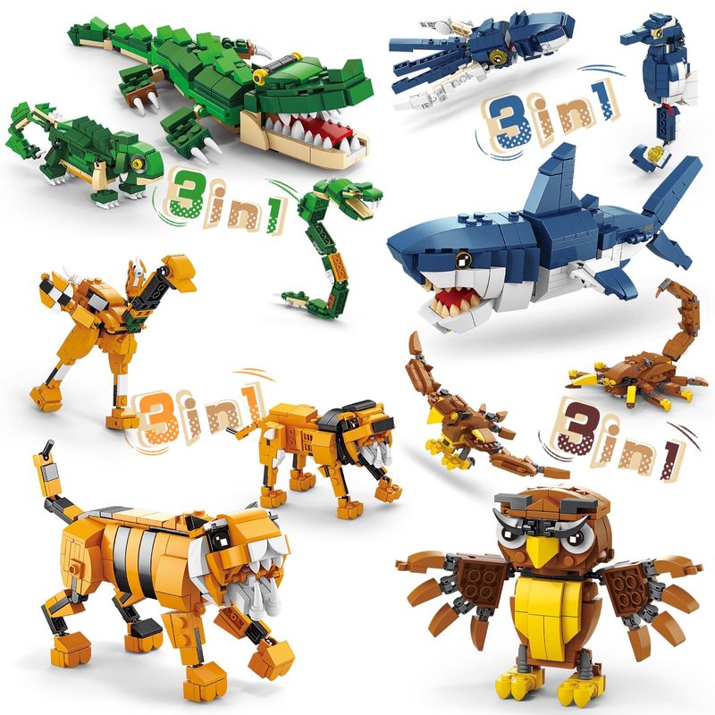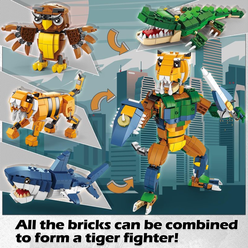 - 12 in 1 Animals Set: Creator 3-in-1 magic transformations: Tiger→Lion/Ostrich, Shark→Octopus/Seahorse, Crocodile→Snake/Lizard, Owl→Bird/Scorpion. Plus, unite all 12 animals into a mighty Animal Mech Warrior for ultimate creativity & fun!