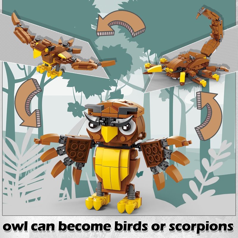 - Unlimited Creativity, Transformative Fun at Your Fingertips! Embark on a journey of endless creativity with the forest animal building sets. Let every build become a thrilling transformation adventure. Watch as the owl seamlessly shifts into a bird or a mysterious scorpion, and the shark instantly morphs into an octopus or an elegant seahorse. Each transformation ignites your child's boundless imagination. More than just a building toy, it's a magical box that sparks creativity!