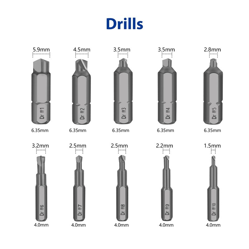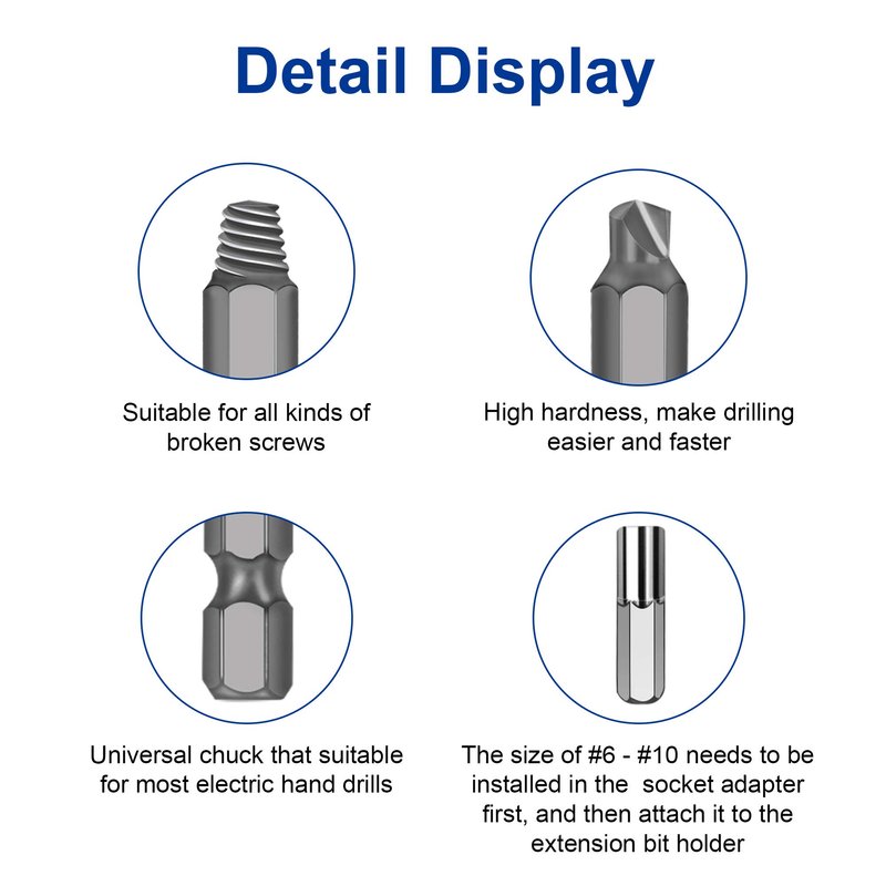 NEW ARRIVAL ⚡⚡⚡ Be91eiter change the traditional ideas and devoted to studying professional broken bolt extractor ✅ High-Speed Steel 4341 ✅ Suitable for general sizes and all kinds of broken bits ✅ Universal chuck that suitable for most electric hand drills ✅ Remove broken screw in one step(Do not need to conversion the extractor or adjust the chuck) How to Use the Screw Extractor? 1. The size of #6 - #10 needs to be installed in the socket adapter first, and then attach it to the extension bit holder (The other sizes can be attached to the extension bit holder directly) 2. Use the drill(Dr) bit to drill a hole in broken screws 3. Change to use the extract(Ex) bit with the same size 4. Reverse use the drill and take out the broken bit Warm Tips : - Must drill a hole first when the break screw surface is smooth. Otherwise the drill bit will slip - Must be vertical and low speed when drilling, reverse use this bit, drill the first hole deeper will easier to take out - It is best to use electric hand drill, can not be used the hammer drill mode! Must be low speed during use! Package Included: 20*Kelepopo damaged screw extractor(Ex#1 - #10, Dr#1 - #10) 1*Magnetic Extension Bit Holder 1*Socket Adapter Kelepopo - Your Professional Tool House We are committed to providing the best quality products, and largely dependent on product feedback from wonderful customers such as yourself. ✦✦✦If you have any questions or concerns about our product, please do not hesitate to contact us, we always here to service you