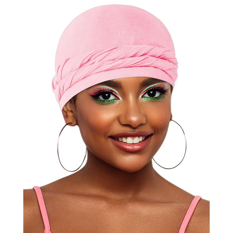 BEACE Silk Satin Lined Pre-Tied Turban Durag Head Wrap for Men & Women, Halo Turban Skull Cap Bonnet Hair Cover for Sleeping Pink