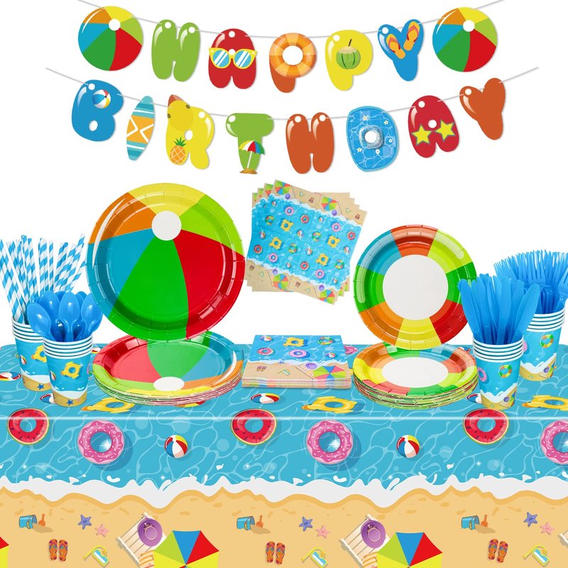 - VALUE PACKAGE - Beach ball birthday party supplies include 1x pool HAPPY BIRTHDAY banner, 20x dinner plates, 20x dessert plates, 20x cups, 20x napkins, 20x tableware, 1x summer beach tablecloth.