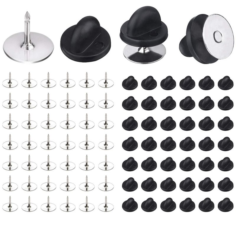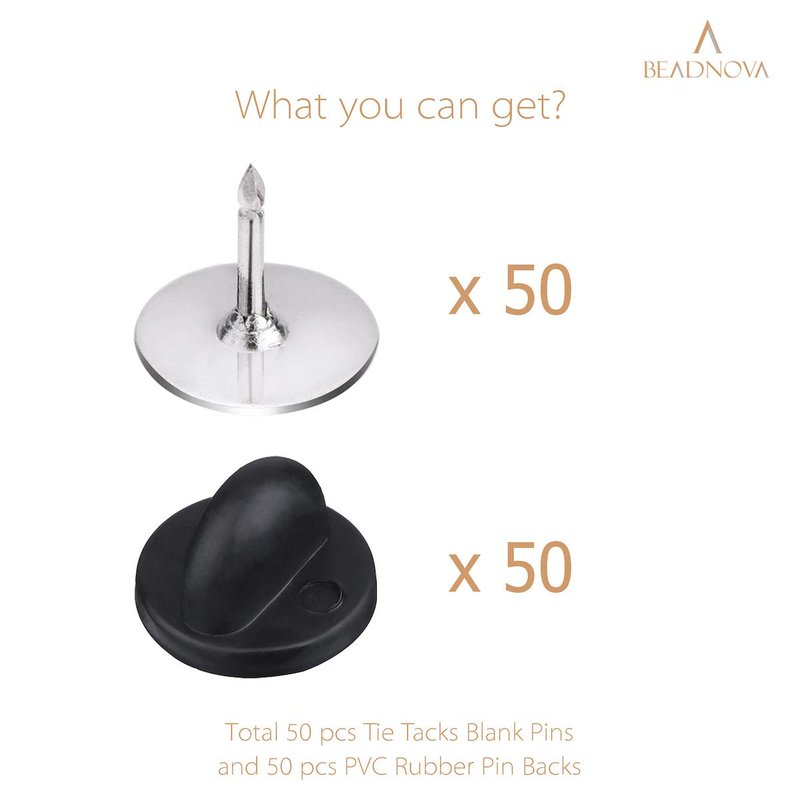 BEADNOVA 50 Pairs Pin Backings Tie Tacks Blank Pins with Rubber Pin Backings Pin Backs for Crafts (Silver Black, 50 Sets)