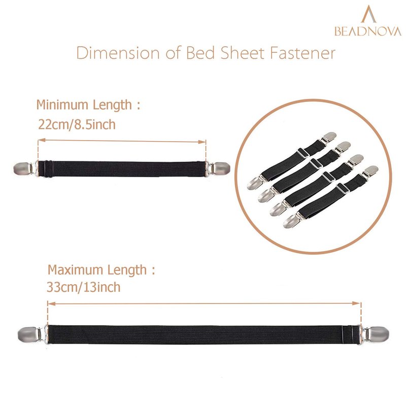 - ADJUSTABLE BED SHEET FASTENERS: Bed sheet holders made of elastic nylon band in 1 inch or 2.5cm wide. Each bed sheet fastener is adjustable from 8.5 to 13 inches (22-33cm), with full extension up to approximately 13 inches (33cm). Adjustable mattress corner clips with strong elasticity, adjustable length allows desired tension to fit your every need for the night.