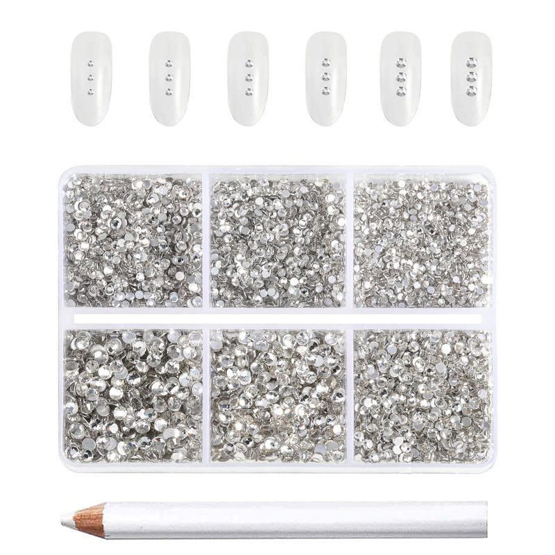 - Pack of 1 box, total 7200 pieces small rhinestones for nails in 6 sizes,one wax pencil for glass rhinestones flatback.Acrylic nails in the main photo are not included, it's only helps to show the small sizes of nail rhinestones.
